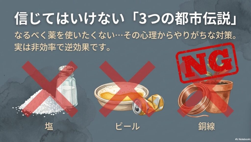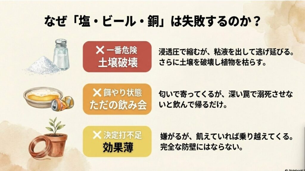 ナメクジ1匹のために貴重な食塩を使い、土までダメにするのは代償が大きすぎます。
