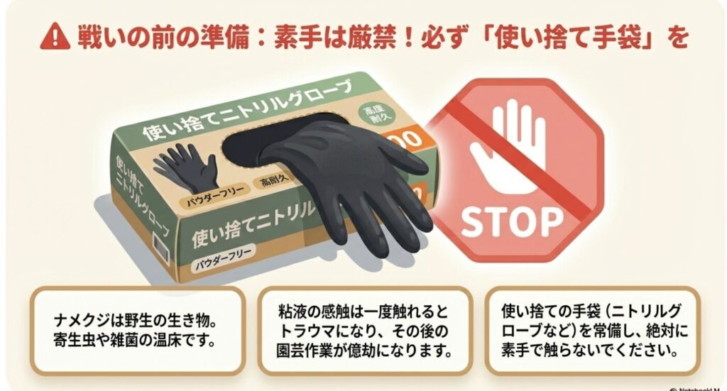 対策を始める前に、まず用意してほしいのが使い捨て手袋(ニトリルグローブなど)です。