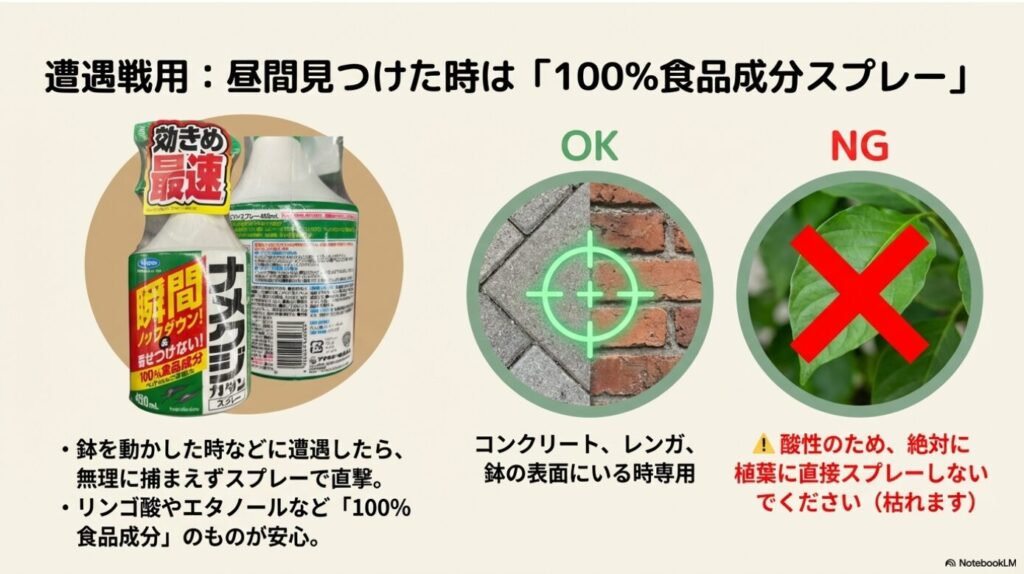 鉢をどかした時などにナメクジを見つけた場合、無理に捕まえようとせずスプレータイプで処理するのが安全です。