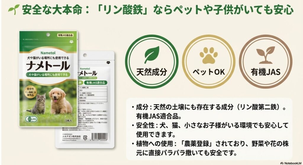 リン酸鉄は天然の土壌にも存在する成分で、犬や猫がいる環境でも使えます。
